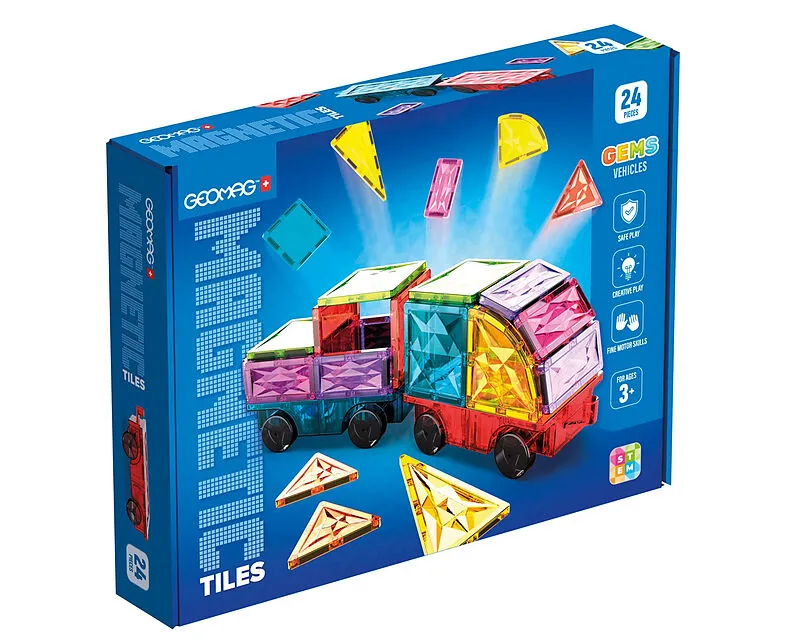 DIE FUNKELNDEN KACHELN FÜR MAGISCHE 3D-KONSTRUKTIONEN! Inhalt: 8 x Quadrate, 2 x gleichseitige Dreiecke, 8 x kleine Rechtecke, 2 x lange, rechtwinkelige Dreiecke, 2 x rechtwinkelige Viertelkreise, 2 x Fahrzeugboden mit Achsen + Rädern - Teile in 8 verschiedene...