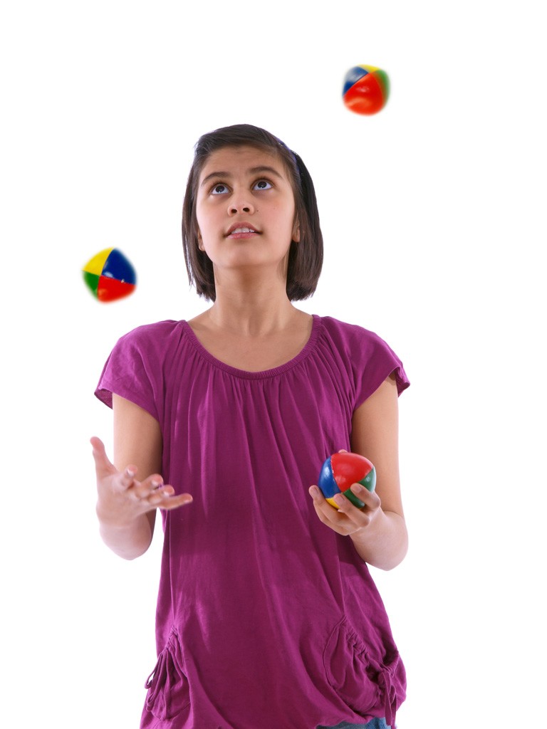 Jonglierbälle, 3-er-Set für den Einsteiger, in rot, gelb, grün und blau, in einer Kunststoffverpackung.