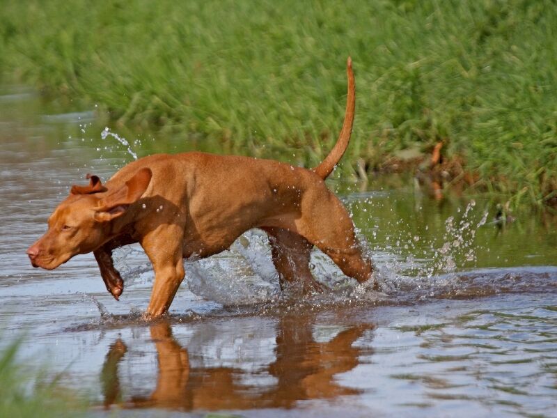 Magyar Vizsla sind inzwischen tolle Familienhunde geworden, doch eigentlich sind sie Jagdhunde. Einen dieser Momente wo ein Vizsla durch das Wasser eilt, wurde für dieses Foto eingefangen.