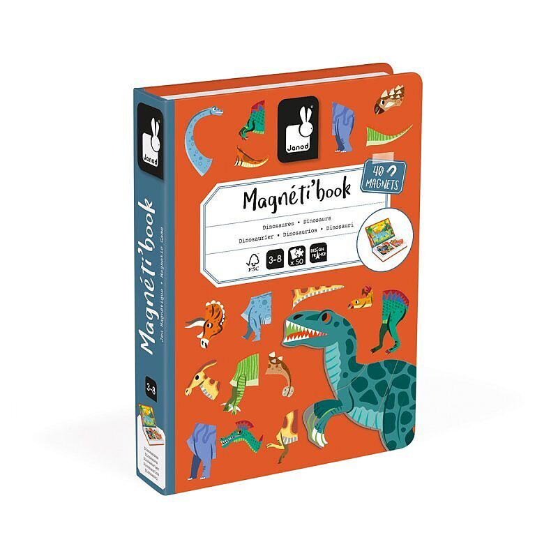 Magnetisches Lernspiel aus Pappe zum Thema Dinosaurier mit 40 Magneten und 10 Karten, auf denen die lateinischen Namen der Dinosaurier angegeben sind. Nach dem Öffnen des Buches soll mit dem auf der Karte gezeigten Dinosaurier mithilfe der Magneten die Szene r...