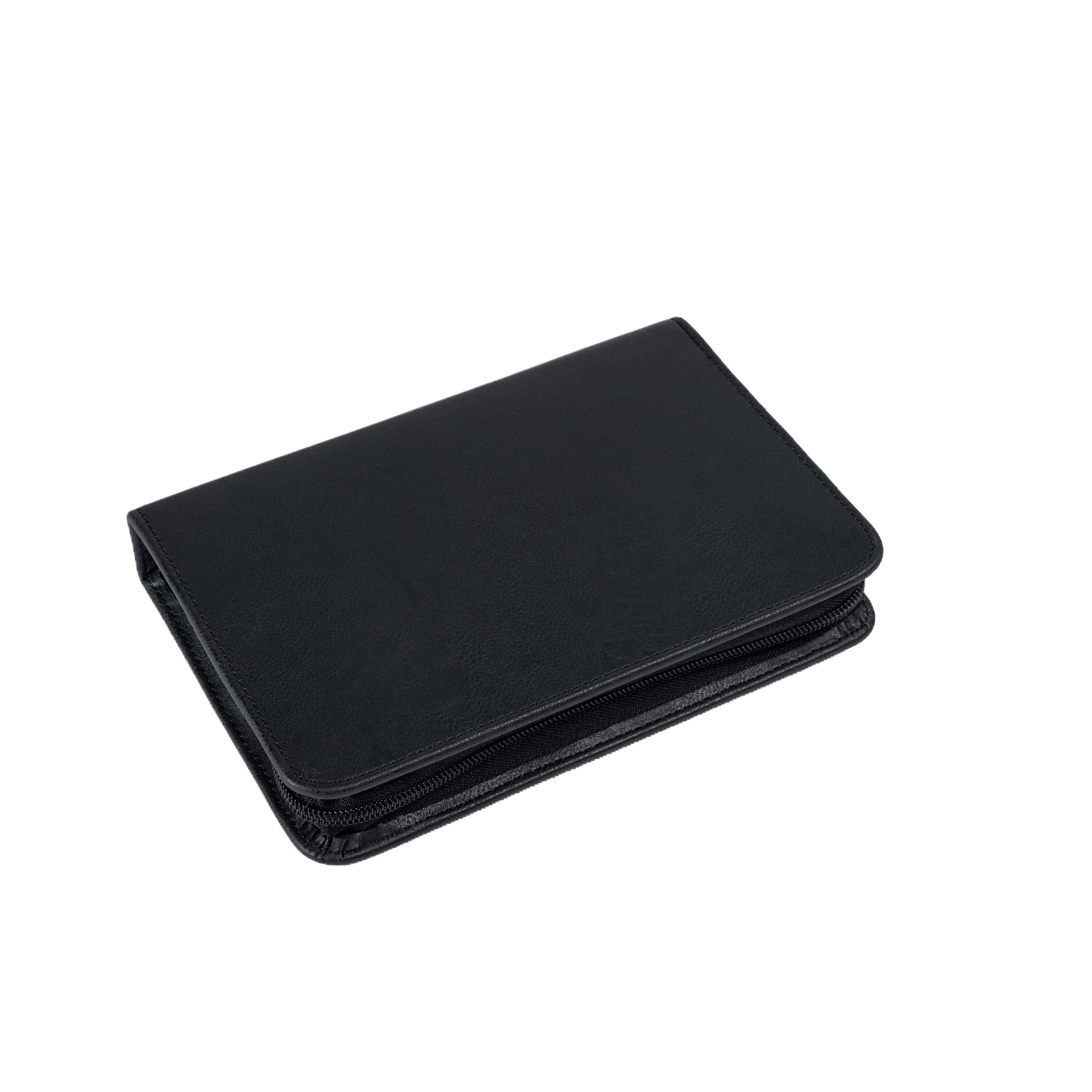Kunstleder-Etui mit Reissverschluss mit 2 Karten- sets, 2 Kreidestiften, 1 Jasstafel mit Holzrahmen, und 1 Schwamm.