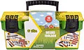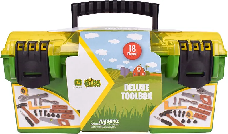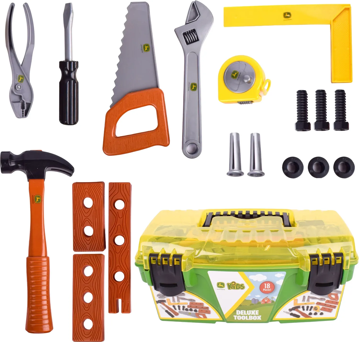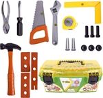 Die Werkzeugbox hat einen Traggriff und Schnappschlösser, und sie ist voll gefüllt mit Spielwerkzeug: Zange, Schraubenzieher, Säge, Schraubenschlüssel, Hammer, Holzteile, Winkelmesser, Massband, Schrauben und Muttern.