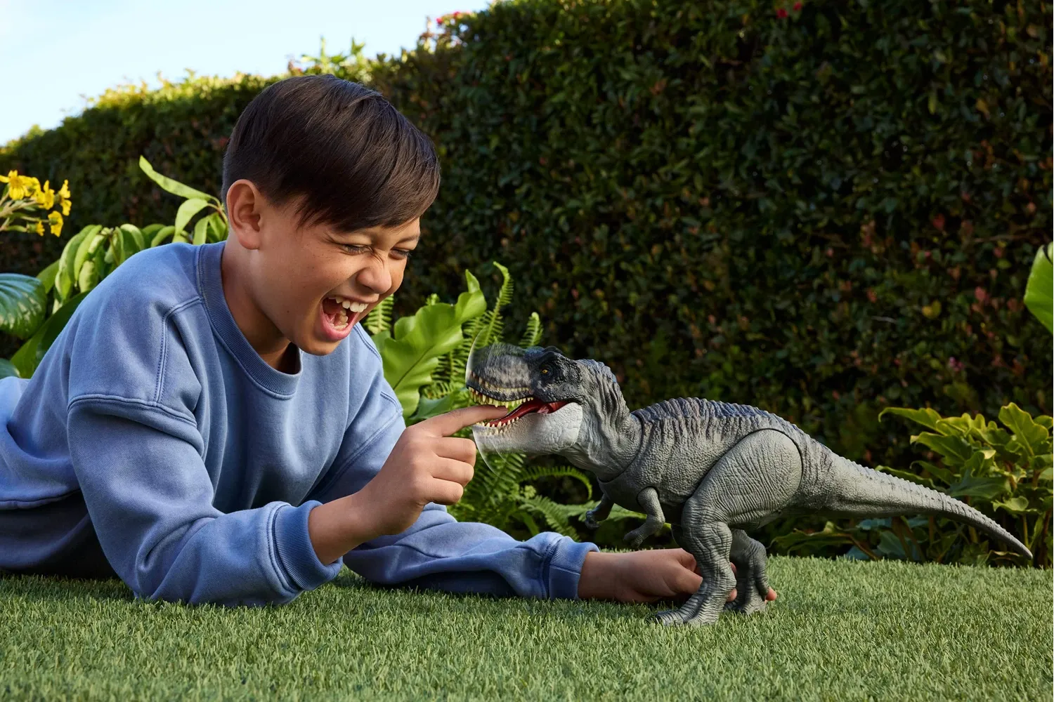Jurassic World REBIRTH Feature T.Rex Dieser Power Devour Tyrannosaurus Rex wurde von Jurassic World Rebirth inspiriert und verfügt über eine furchterregende Beiß-Attacke! Wird seine Zunge heruntergedrückt, gibt er zuerst ein lautes Brüllen von sich. Wird sie n...