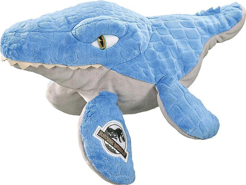 Das Abenteuer von Jurassic World ruft! Mit dem MOSASAURUS, dem eigentlich riesigen, starken Wasserwesen, hier etwa 29 cm groß als weiche Plüschfigur zum Spielen, zum Kuscheln und zum Sammeln!