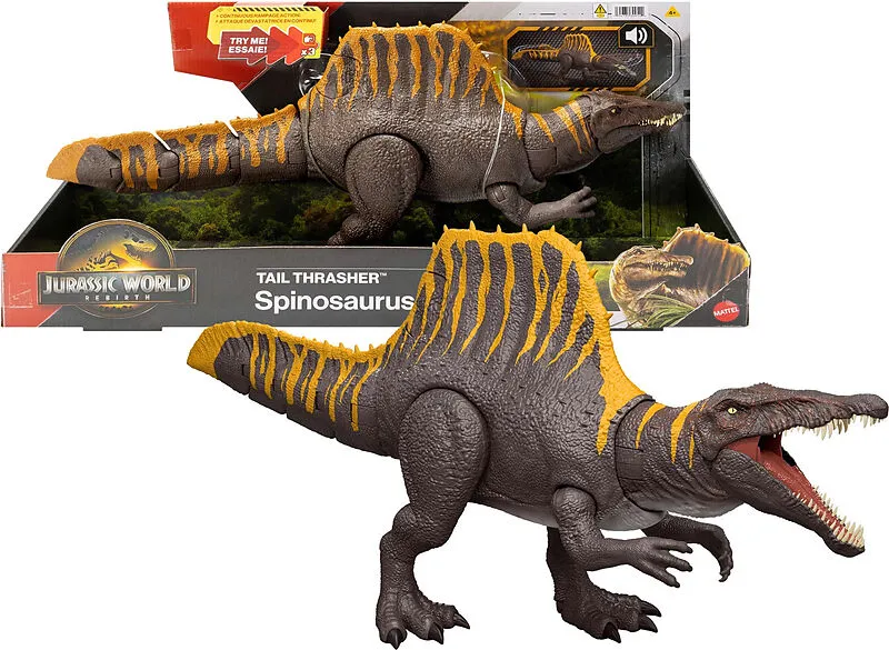 Jurassic World Saga Spinosaurus Diese Tail Thrasher Spinosaurus-Actionfigur mit authentischem Design und auffälligem Segel bringt die Spannung von Jurassic World Rebirth nach Hause. Eine per Knopfdruck aktivierte Doppel-Attacke lässt den Kopf und den Schwanz h...