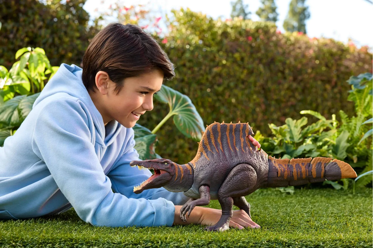 Jurassic World Saga Spinosaurus Diese Tail Thrasher Spinosaurus-Actionfigur mit authentischem Design und auffälligem Segel bringt die Spannung von Jurassic World Rebirth nach Hause. Eine per Knopfdruck aktivierte Doppel-Attacke lässt den Kopf und den Schwanz h...