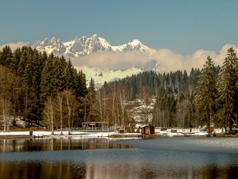 Das Kaisergebirge in Tirol besteht aus zwei Teilen, dem Zahmen und dem Wilden Kaiser. Der markante, felsige Gebirgsstock heißt "Der Wilde Kaiser". Der Blick mit dem Heustadel vor dem Schwarzsee und im Hintergrund der Wilde Kaiser ist ein bekanntes Mo...