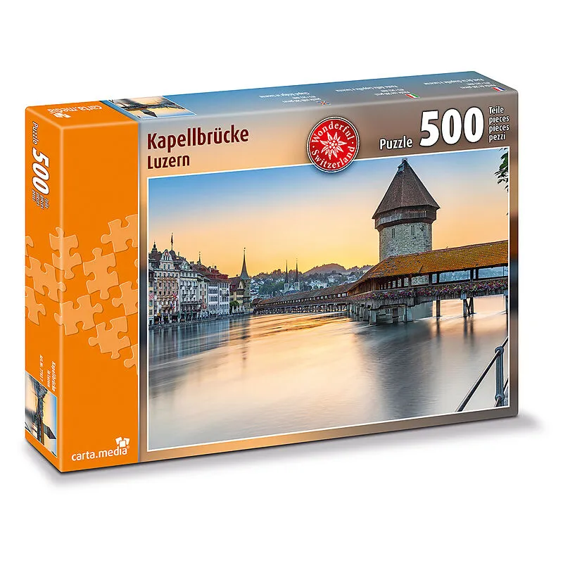 Puzzle mit 500 Teilen der Kapellbrücke in Luzern, am frühen Morgen. Puzzleformat 49 x 36cm. Luzern ist der Ausgangspunkt zur Erlebnisregion Luzern-Vierwaldstattersee und bietet eine Vielfalt zum Entdecken. Jahrhundertealte Sehenswurdigkeiten wie die Kapellbruc...