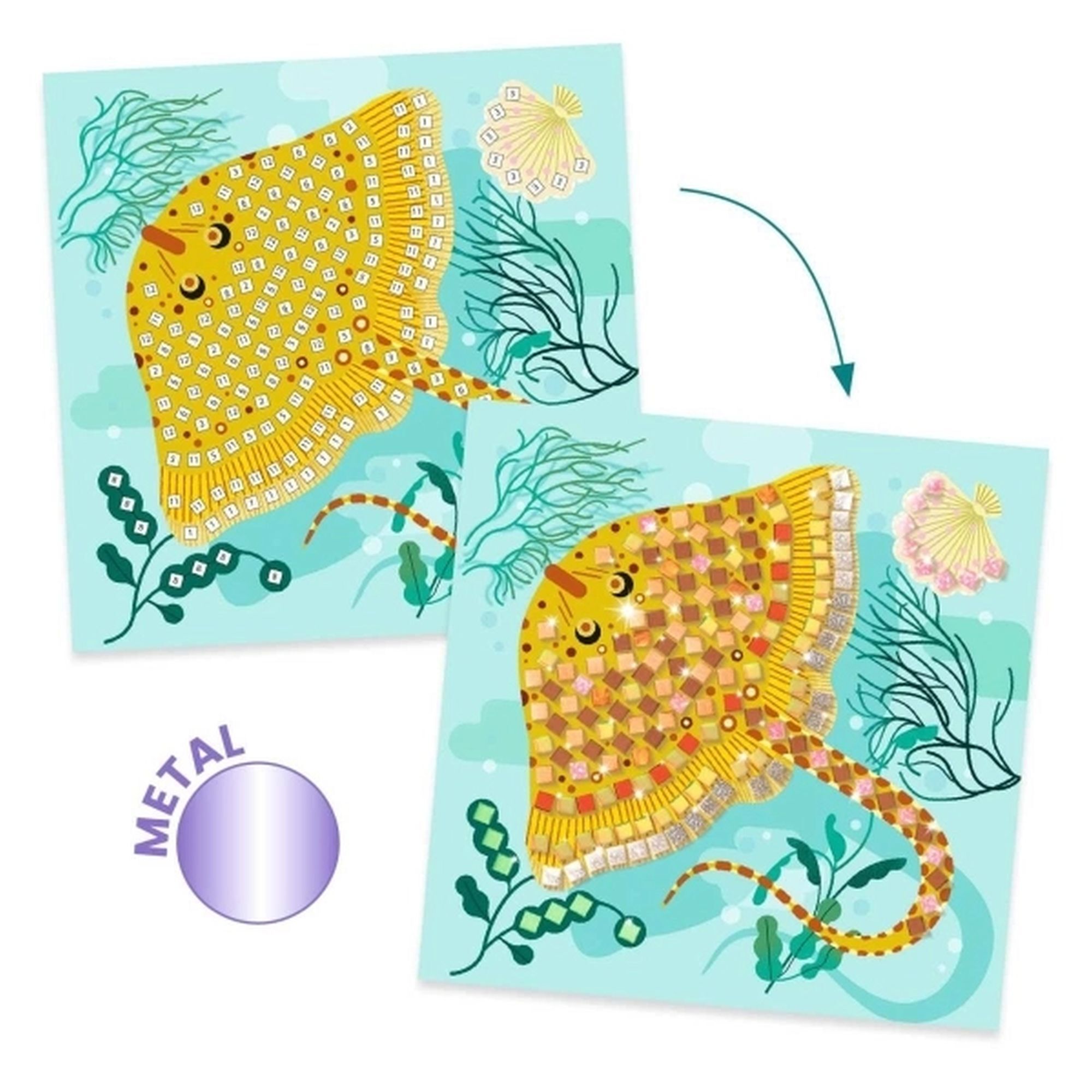 ab 5 Jahren 4x Illustrierte Karten 12x Bögen mit selbstklebenden Mosaiksteine aus Schaumstoff Eine Box, um die Kunst des Mosaiks zu lernen, indem man die Outfits dieser liebenswerten Charaktere verschönert. 4 Bilder zum Vervollständigen mit kleinen Quadraten a...