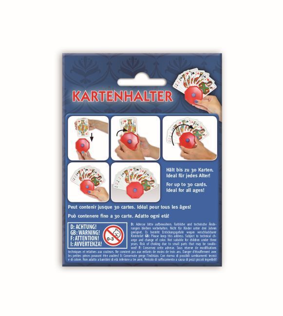 Spielkartenhalter. Problemlos auffächern, halten und abstellen! Hält bis zu 30 Karten. Ideal für jedes Alter! Kartenpack in den Kartenhalter stecken, beide Scheiben gegeneinander drehen und Karten gleichmäßig auffächern. Karten können beim Spielen problemlos g...