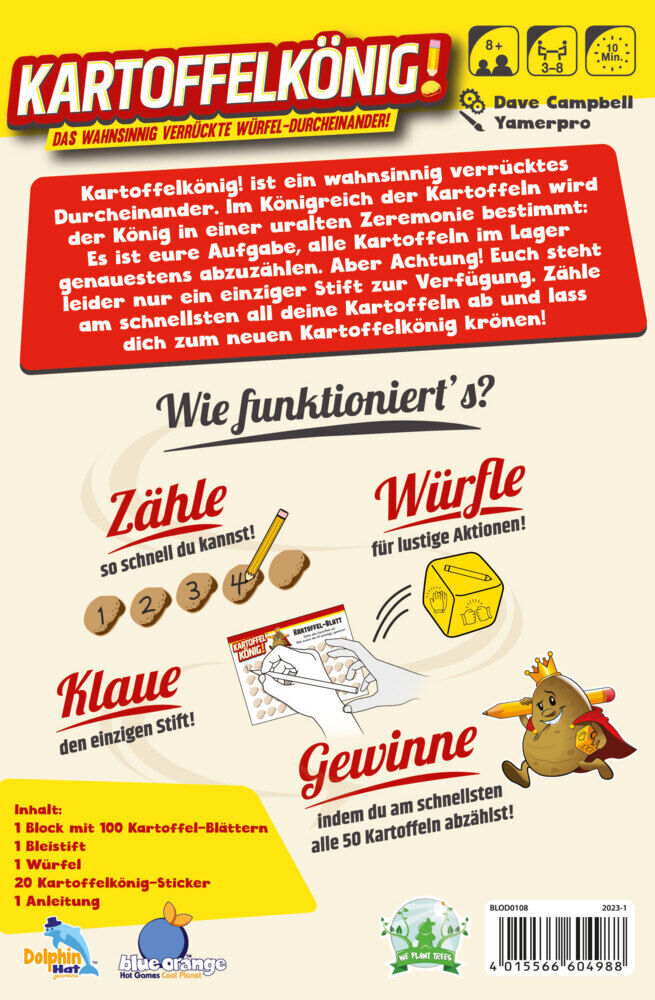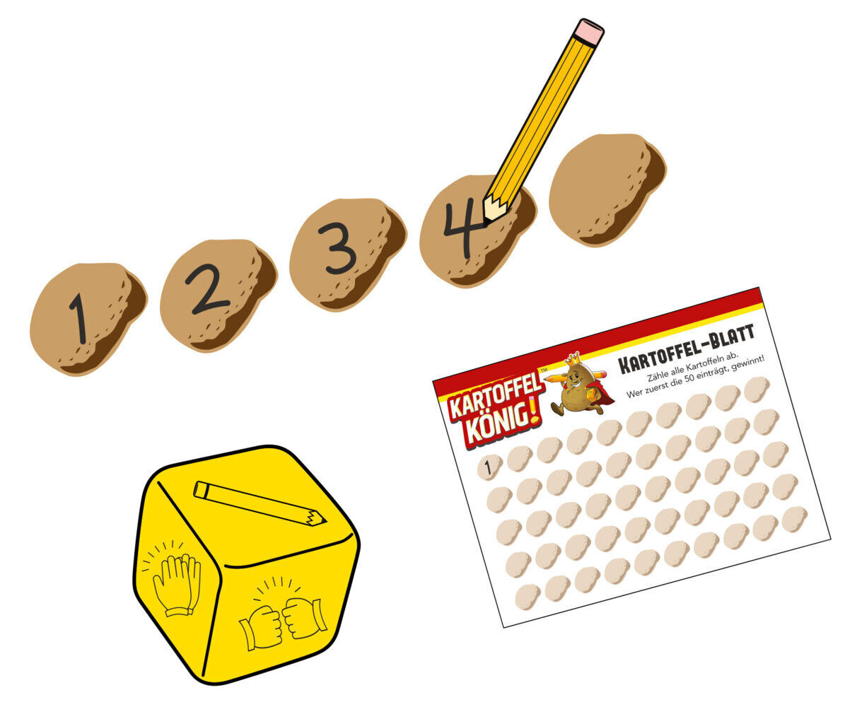 Im Partyspiel Kartoffelkönig! stellen sich die Spieler dem wahnsinnig verrückten Würfel-Durcheinander. Das eigene Kartoffel-Blatt will mit den Zahlen von 1 bis 50 beschriftet werden, allerdings hat nur eine Person den Stift. Durch wildes Gewürfel wandert der S...