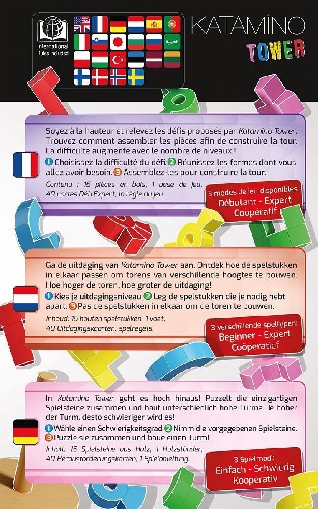 Katamino Tower katapultiert den Puzzleklassiker Katamino in eine neue Dimension! In über 40 verschiedenen Herausforderungen gilt es, die einzigartigen Holzteile zu einem Turm mit mehreren Ebenen zusammenzubauen. Dabei steigt der Schwierigkeitsgrad immer weiter...