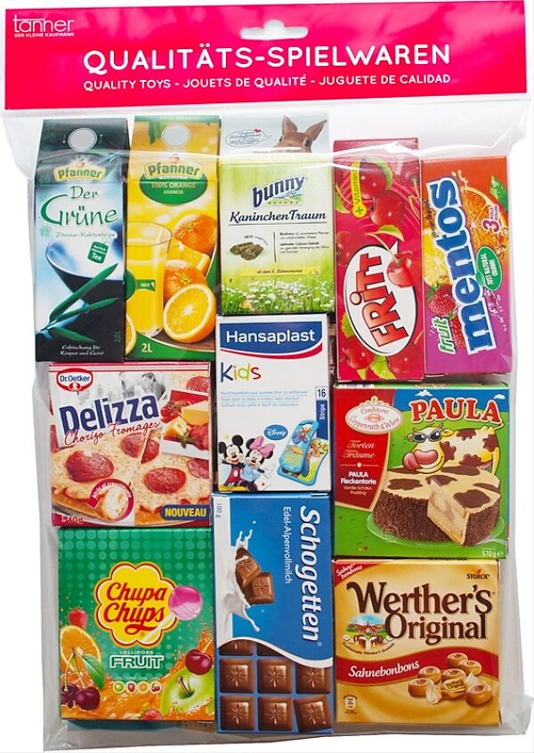 Gefüllt mit zahlreichen Lebensmittelverpackungen. Die optimale Ergänzung für jeden Kaufladen. 15 Teile. Leerverpackungen. Ab 3 Jahren.