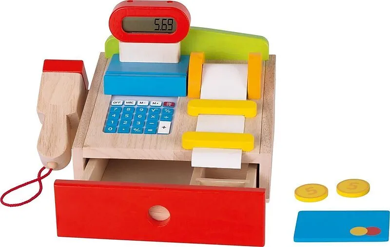 Eine voll funktionstüchtige Kasse mit Scanner, Taschenrechnerfunktion, Kreditkarte, Papierkassenrolle und echtem Display. Zubehör für kleine Kaufleute mit großem Umsatz: 51533 Kassenrolle Altersempfehlung: 3+ Material: Holz Funktion: Taschenrechner Artikelmaß:...