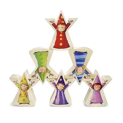 sechs bunte Holzmagier + 2 große Hartgummibälle + 1 Bauwollbeutel zur Aufbewahrung Eine bezaubernde kleine Mannschaft aus sechs kleinen Magier-Freunden wartet auf ihren Einsatz. Hintereinander in Position gestellt laden sie zu einer turbulenten Kegelpartie ein...