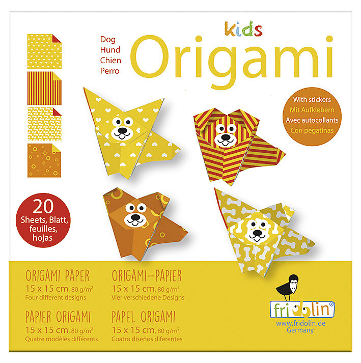 Origami-Modell: Hund Mit lustigen Aufklebern (je nach Modell) 4 verschiedene Papier-Designs Traditionelle Faltaufgabe zur Förderung von Konzentration und Fingerfertigkeit