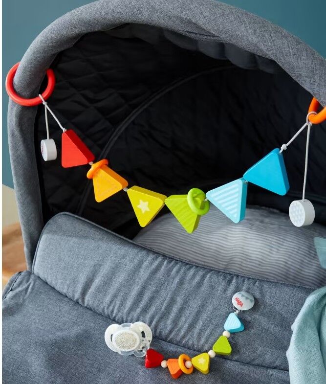 Farbenfroher Begleiter: Kinderwagenkette Wimpelchen von HABA - für nahezu alle Kinderwagen- und Babyschalen-Modelle - lädt Babys zum Schauen und Greifen - bunte Ringe klappern lustig bei Bewegung - die dekorative Mobile-Kette ist von Geburt an geeignet Länge: ...
