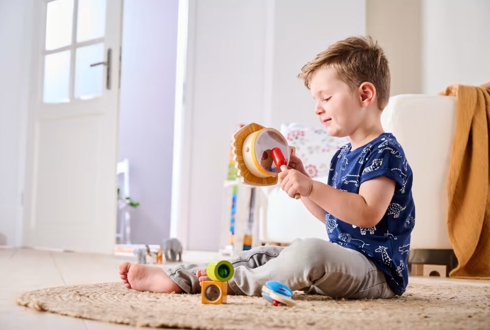 Löwenstarke Percussion mit dem Klangspielset von HABA - für erstes Musizieren allein und in der Gruppe - mit zwei Akustiksteinen, Kastagnette und 3-in-1 Trommel - niedlicher Löwe zum Trommeln, Rasseln und Rattern - mit praktischem Griff ideal für kleine Kinder...