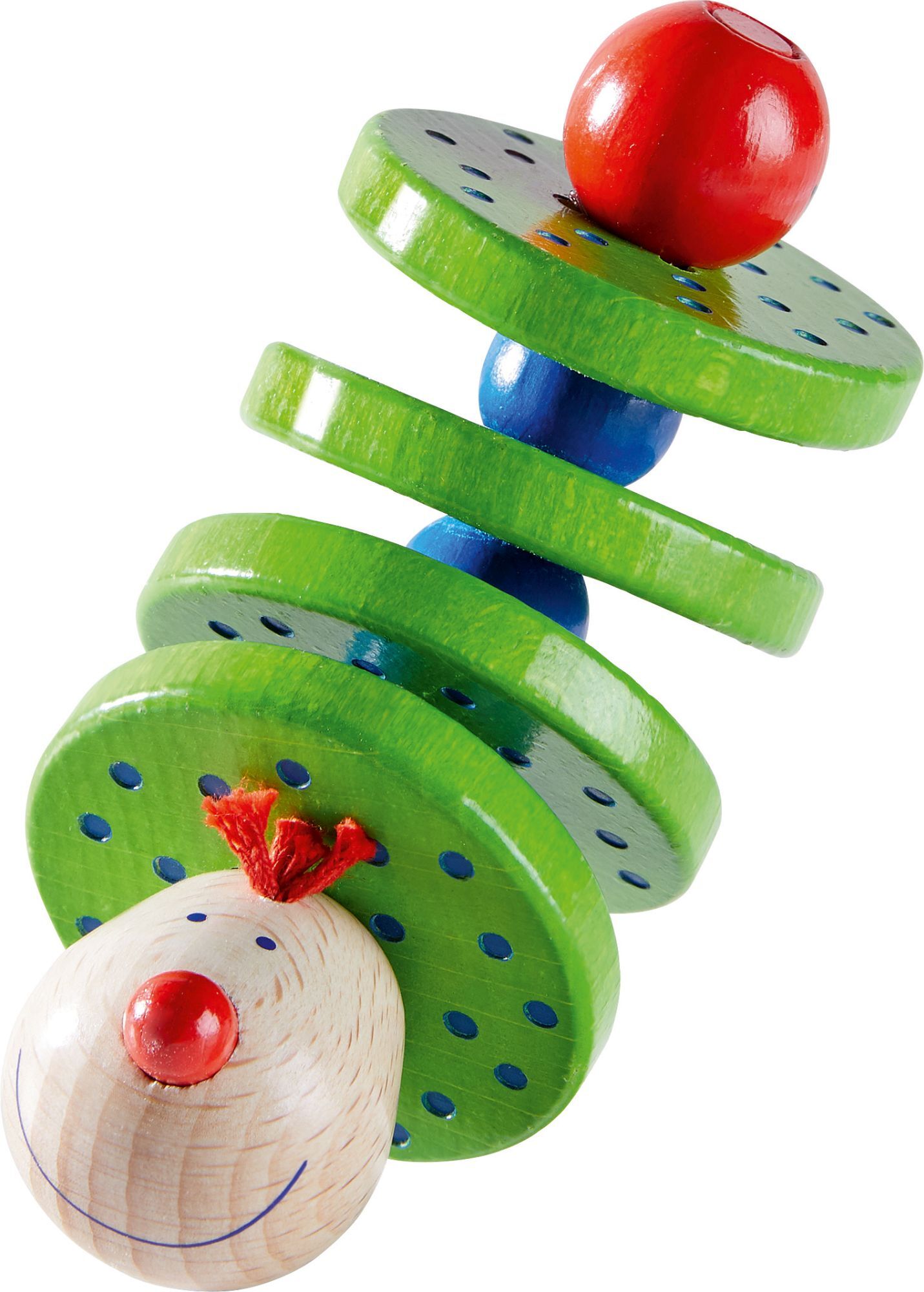 Die Raupe Flapsi klappert lustig in Babys Hand. Holzteile auf Gummiband gefädelt. Aus Buche. Länge: 11 cm.