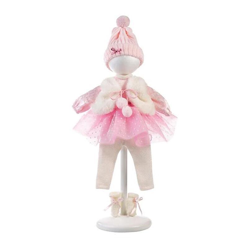 Stylisches Kleiderset mit gepunktetem Tütükleid kombiniert mit weissen Strümpfen, flauschiger Weste, weissen Söckchen und rosa Mütze. Passend für 38cm - 40cm Puppen.