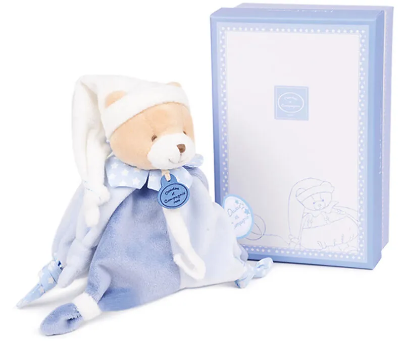Mit Schlafmütze und lieblichen Details begleitet der kleine Bär mit Schnullerkette das Neugeborene vom ersten Tag an. Verpackt im dazu passenden Geschenkkarton. Maschinenwäsche bei 30° Grad. Grösse: 17 cm