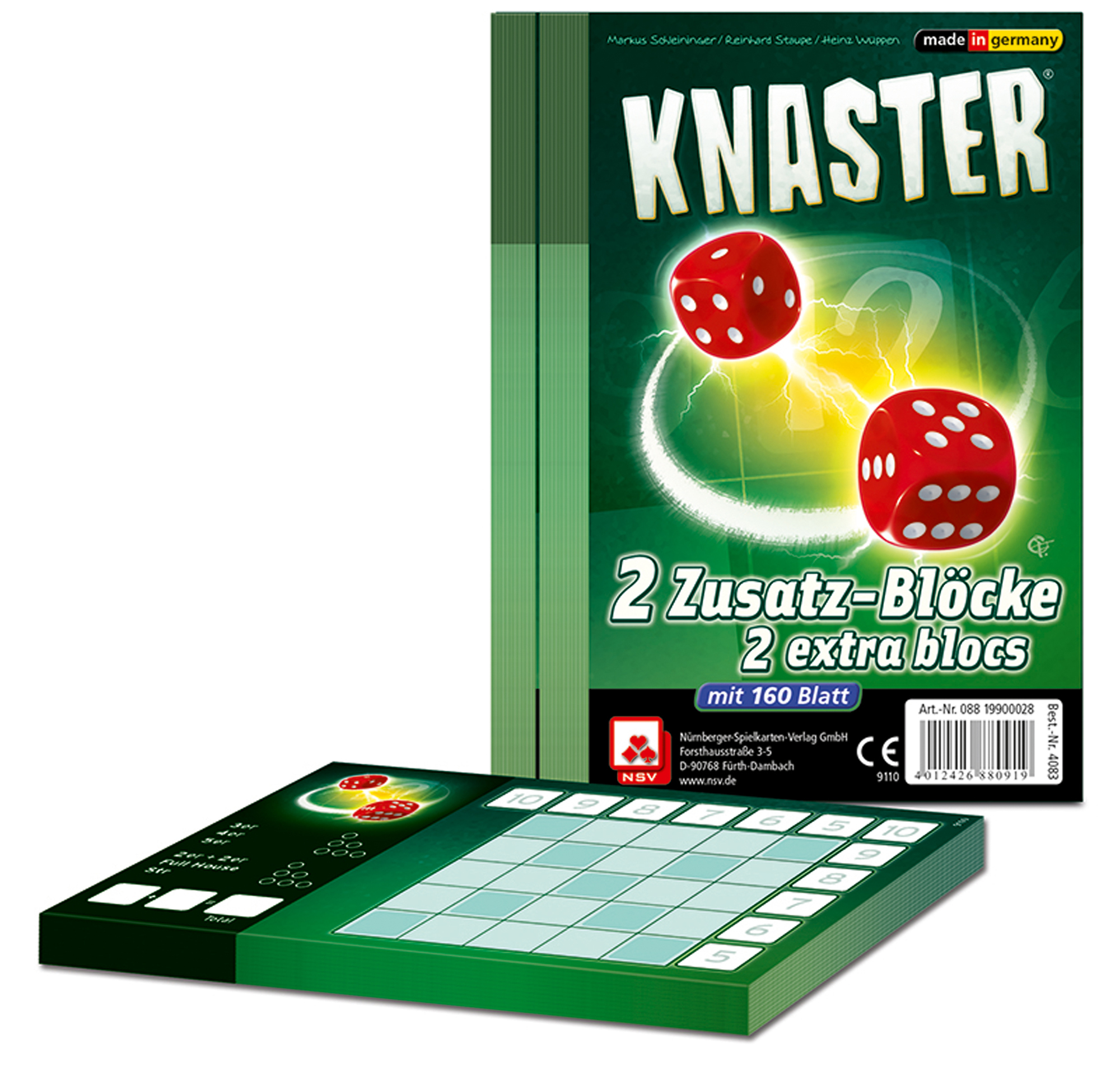 2 Zusatz-Blöcke (2x80 Blatt) für Knaster Unser erfolgreiches Würfelspiel «Knister» hat Zuwachs bekommen - «Knaster» heißt er! genauso einfach, aber deutlich mehr Möglichkeiten und Planung. Mit Ergebnissen wie Drilling, Full House und Straße darf man Zahlen ein...