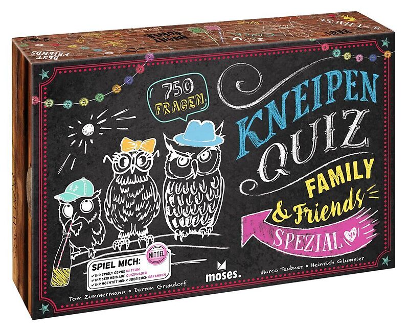 Kneipenquiz - Family & Friends Spezial Das Kultspiel Kneipenquiz jetzt auch als Sonderedition mit Fragen über die Liebsten: Wer kennt die Lieblingspizza des besten Freundes und wer weiß, wohin Mama mit einer Zeitmaschine reisen würde? In der Family & Friends S...