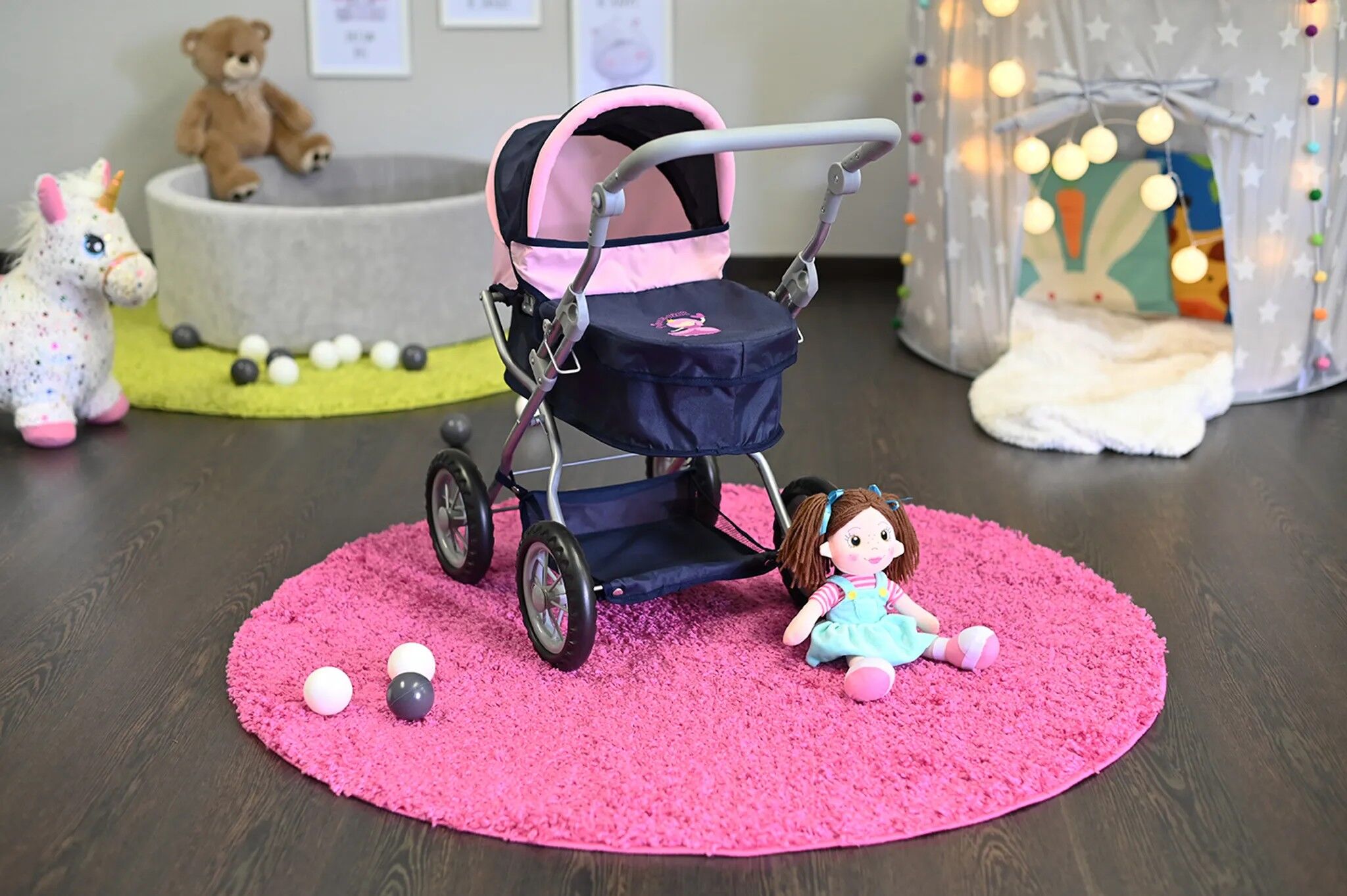 Top moderner Puppenwagen First von knorrtoys mit verstellbarem Verdeck und Einkaufsnetz. Ein höhenverstellbarer Schieber mit Softummantelung (ca. 40 - 66 cm) ermöglicht das Mitwachsen des Wagens mit den Puppeneltern. Durch das einfache Zusammenklappen, wird ei...