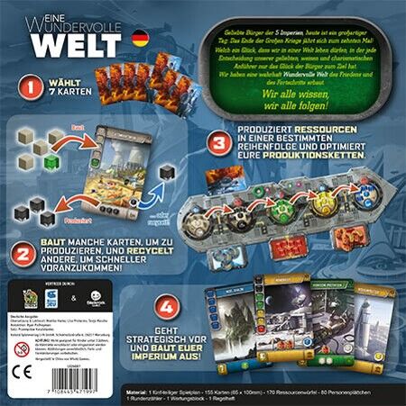 Drücke der wundervollen Welt deinen Stempel auf, indem du deinem Volk die Weltherrschaft sicherst! Frdric Gurard Eine wundervolle Welt ist ein kompetitives Kartenwahl- und Tableaubauspiel mit einem einzigartigen sequentiellen Ressourcenproduktionsmechanismus f...