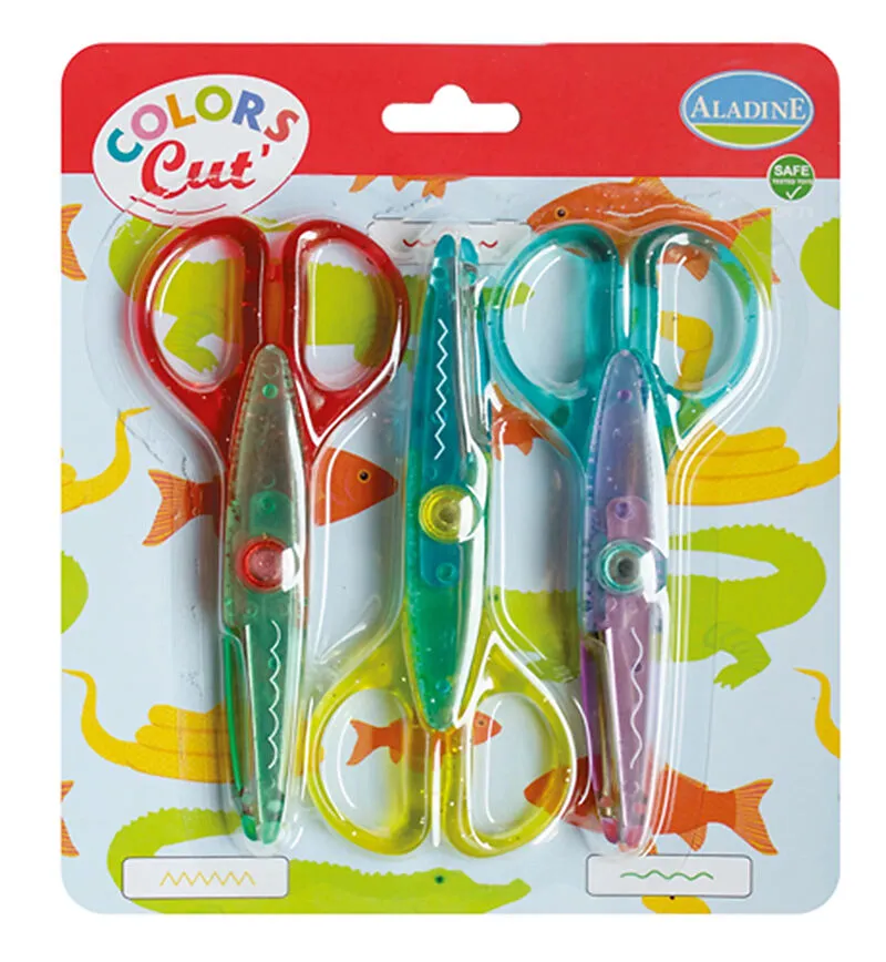 Bunte und glitzernde Konturenscheren für den kreativen Einsatz mit Papier. Die drei Scheren verfügen über unterschiedliche Farben und Konturen.