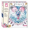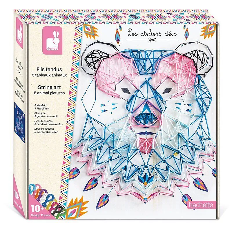 5 Fadenbilder zum Selberspannen mit 10 verschiedenen Baumwollfäden von je 7 Metern, 800 Nägeln und 1 Werkzeug für das Setzen der Nägel. Inklusive 1 Heft mit Vorlagen und Anweisungen.