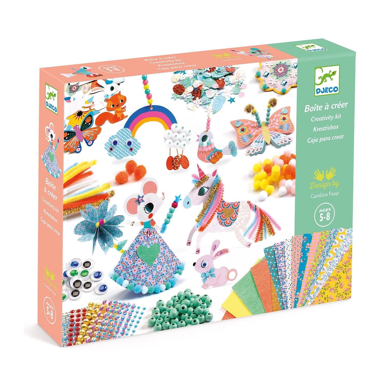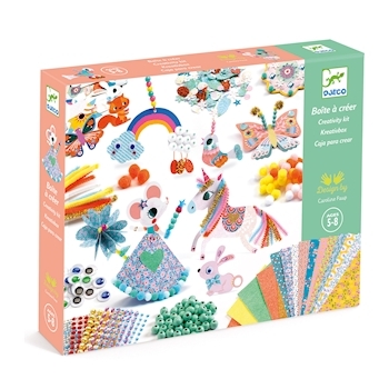 ab 5 Jahre Die Kreativbox ist eine 2 Stöckige Box mit verschiedenen Perlen, Pompoms, Augen, Stickern, Edelsteinen, Chenille-Draht, 20 Ideenkarten, diverse Schablonen sowie Leim, Schere und eine 4m Perlenschnur.