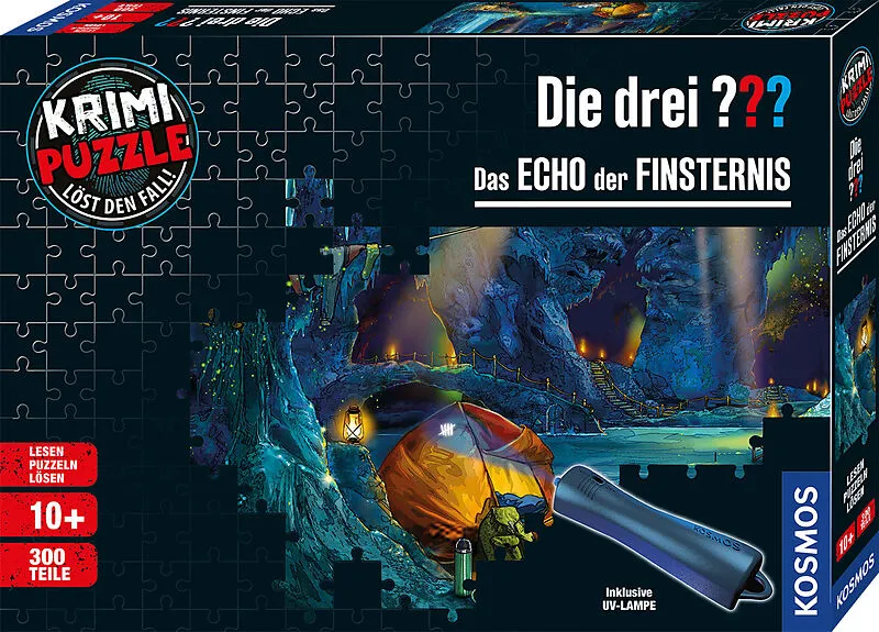 300 Teile Puzzle mit exklusiver Kurzgeschichte und tollem Detektivgadget. Ein neuer Fall für die drei ??? im Puzzleformat! Bei einer Höhlenbesichtigung entwickelt sich der Alaska-Urlaub für Justus, Peter und Bob zu einer gefährlichen Verfolgungsjagd. Enge, ver...