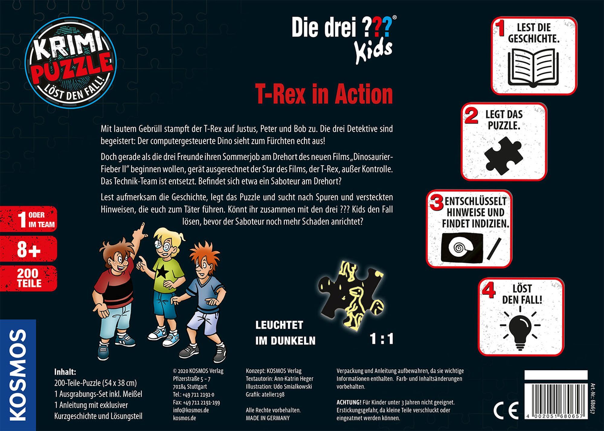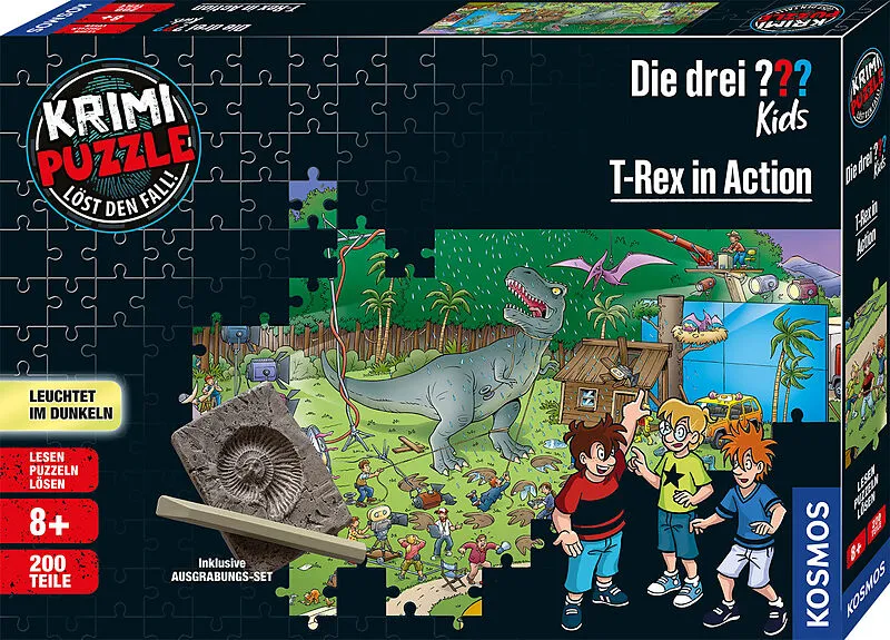 "Kriminalfall Lesen, Leuchtpuzzle legen, Fall lösen! Bei einem Filmdreh über Dinosaurier gerät der computergesteuerte Star des Films, ein T-Rex außer Kontrolle ist etwa ein Saboteur am Werk? Die drei ??? übernehmen den Fall und müssen ihn lösen und die Spieler...