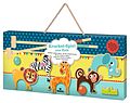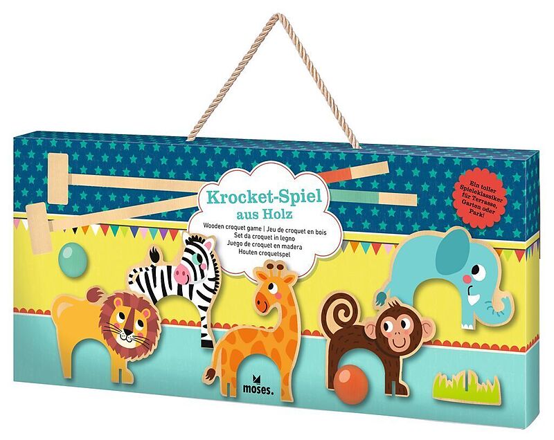 ein Minigolf-Spiel für drinnen und draußen Inhalt: 5 Tore in Tierform, 2 farbige Spielkugeln und 2 Schläger Figuren ca. 161 mm x 196 mm (Giraff e) Kugeln ca. Ø 4 cm, Schläger ca. 42 cm aus Holz Spieleranzahl: 2 Spieler