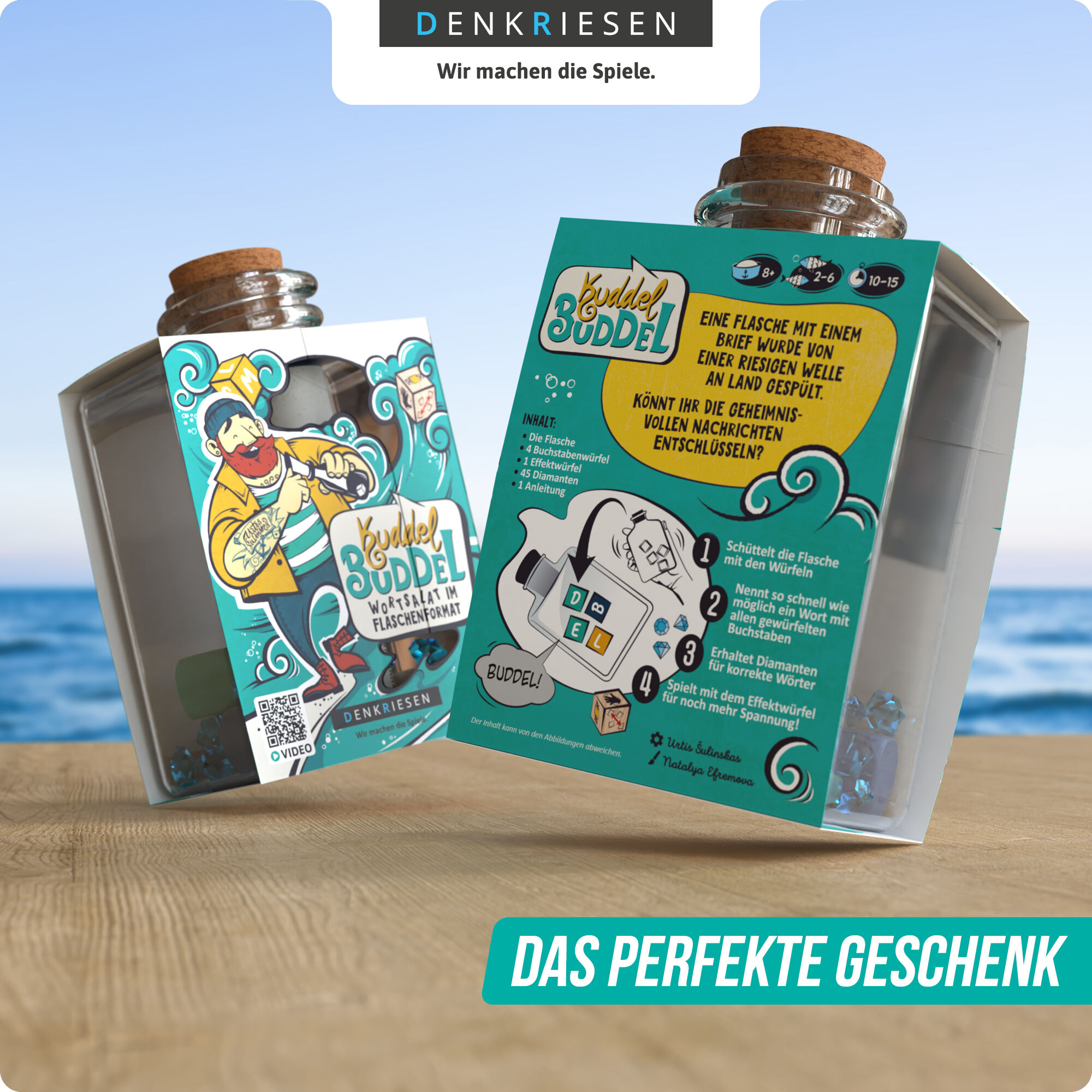 Kuddel Buddel - ''Wortsalat im Flaschenformat'' Eine Flasche mit einem Brief wurde von einer riesigen Welle an Land gespült. Könnt Ihr die Geheimnisvolle Nachrichten entschlüsseln? Schüttelt die Flasche mit den Würfeln. Nennt so schnell wie möglich ein Wort mi...