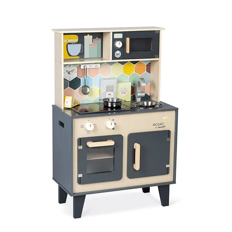 So wie Papa und Mama bereite leckere kleine Gerichte für deine Freunde vor und werde ein echter Küchenchef!!! Moza'c-Supergrosse Küche ganz aus Holz mit Hängelement zum Aufhängen von 1 Schaumkelle, 1 Topf und 1 Sieb und 3 Lebensmittelkartons (Käse, Mehl, Reis)...