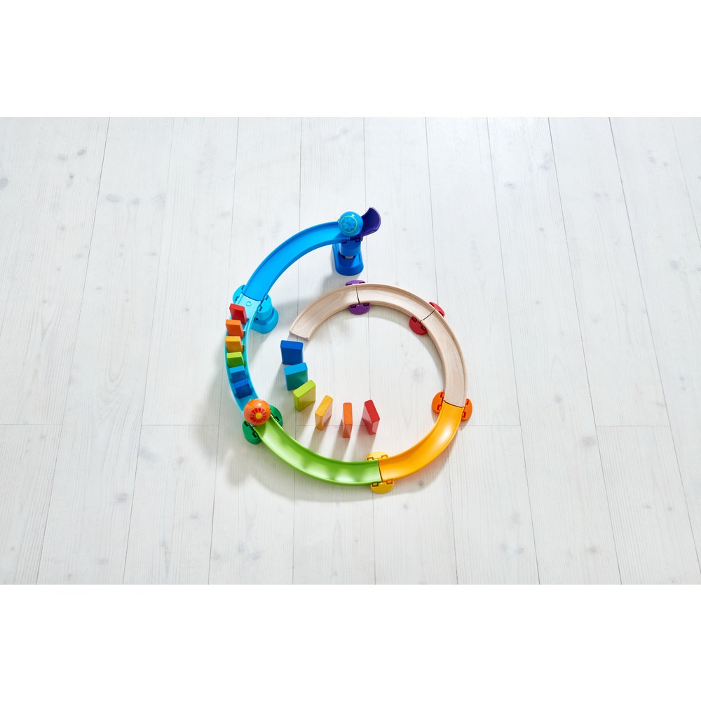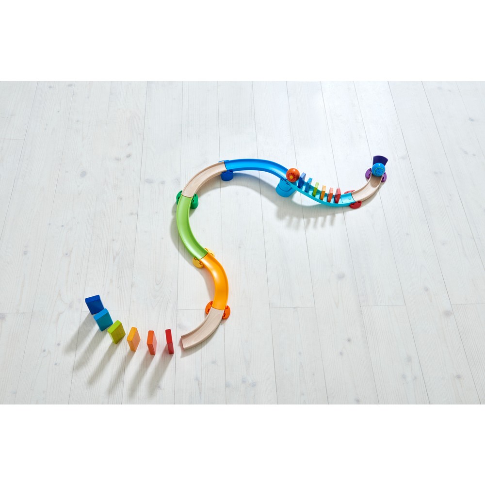 Die bunte Kullerbü-Kugelbahn Kringel-Domino von HABA bringt Kullervergnügen und Domino-Spiel zusammen: Die erste Kugel kullert und, schwups, schon fallen die kleinen Dominosteine auf der Dominotreppe in den schönsten Regenbogenfarben der Reihe nach um und zwar...