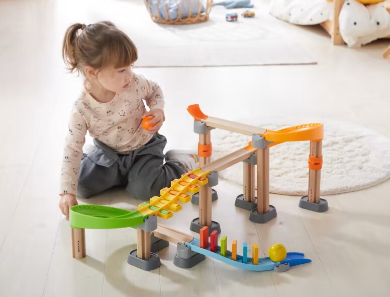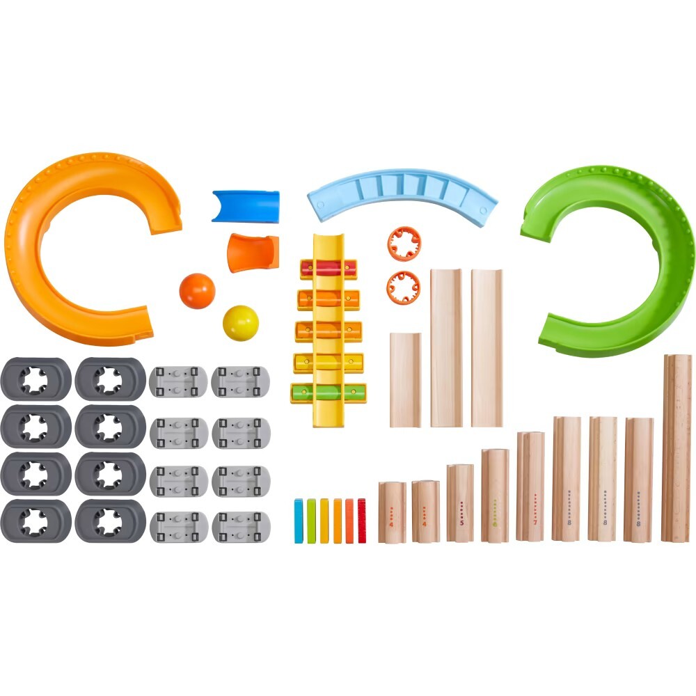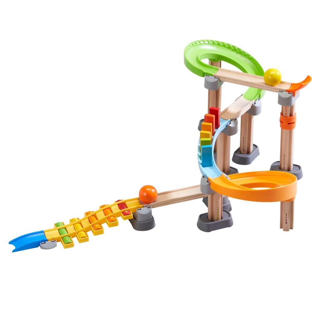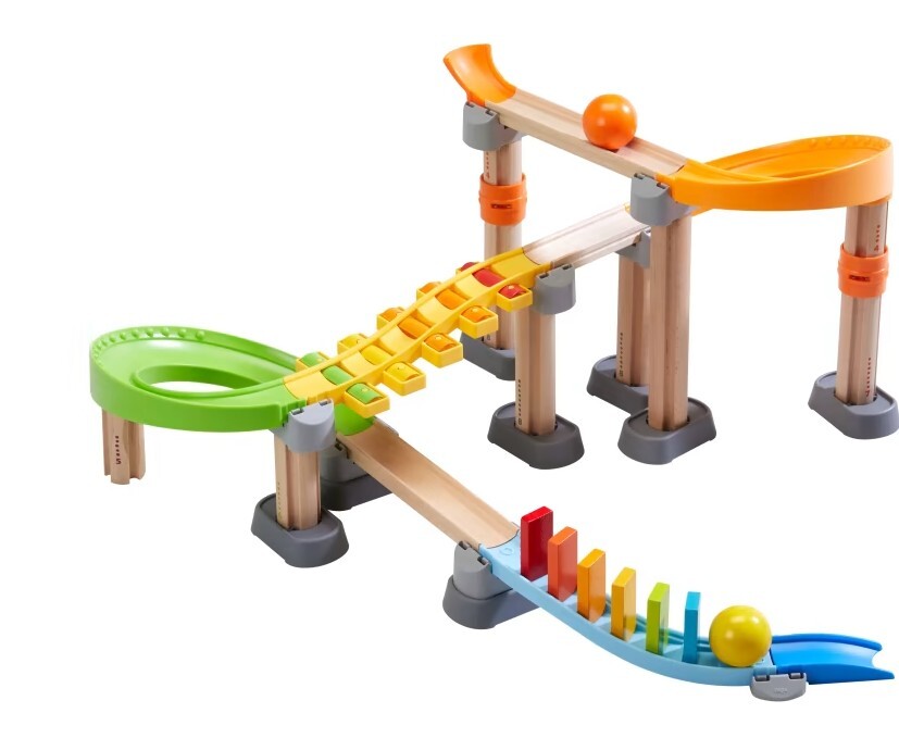 Auf in ein schwungvolles KullerbüAbenteuer von HABA! Die Kugelbahn Melodie-Domino bringt Musik ins Spiel. Kullern die Kugeln über die Klangtreppe, erklingt eine fröhliche Tonfolge. Auch Fahrzeuge können die Klangtreppe befahren. Zwei große Steilkurven sorgen f...