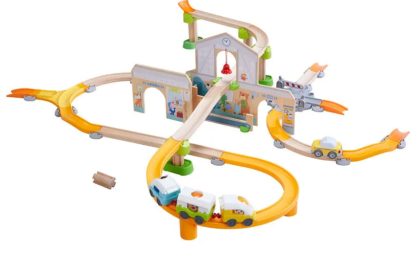 Der Bahnhof für die Kullerbü-Spielbahn von HABA ist eine große Spielkulisse für Kinder ab 2 Jahren. Über die abwechslungsreichen Holzschienen fährt ein moderner Schnellzug. Die drei Waggons lassen sich aufklappen, damit die drei Charakterkugeln ein- und ausste...