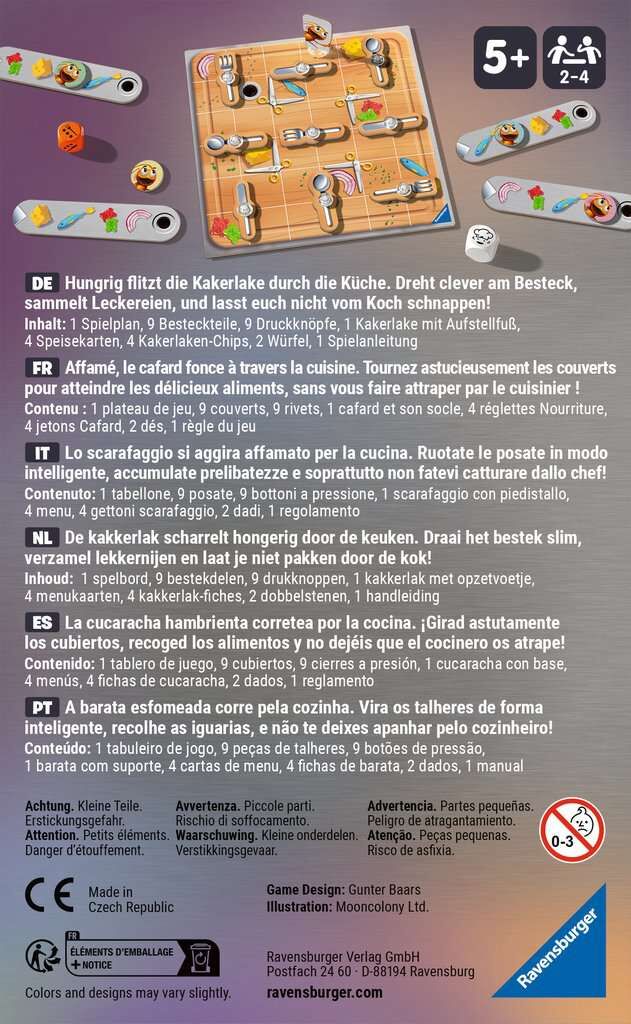 Hungrig flitzt die Kakerlake durch die Küche. Mit etwas Würfelglück und einem cleveren Dreh am Besteck gelangt sie schnell zu den Leckereien. Doch sobald der Koch erscheint, ist es sofort vorbei! Mit einfacher Einstiegs- und rasanter Actionregel.