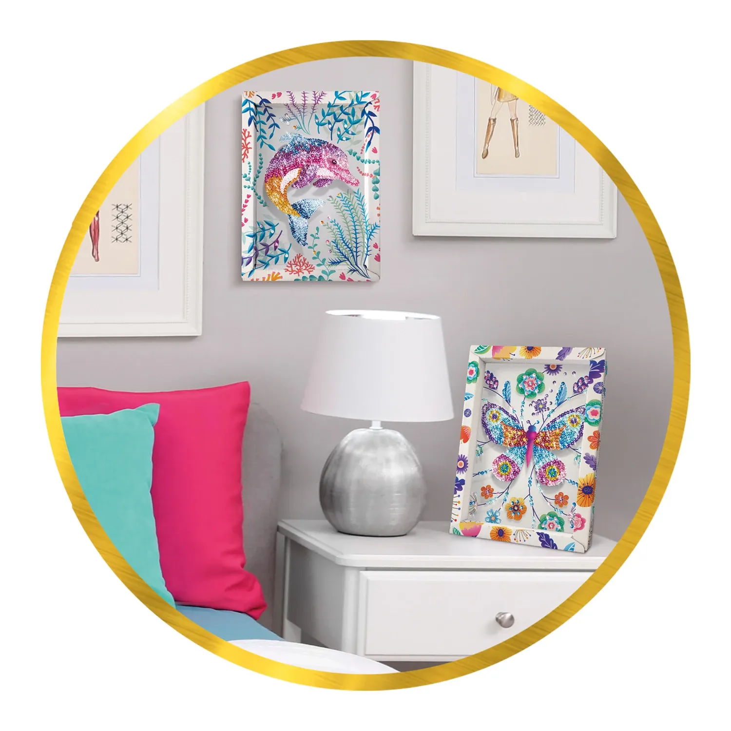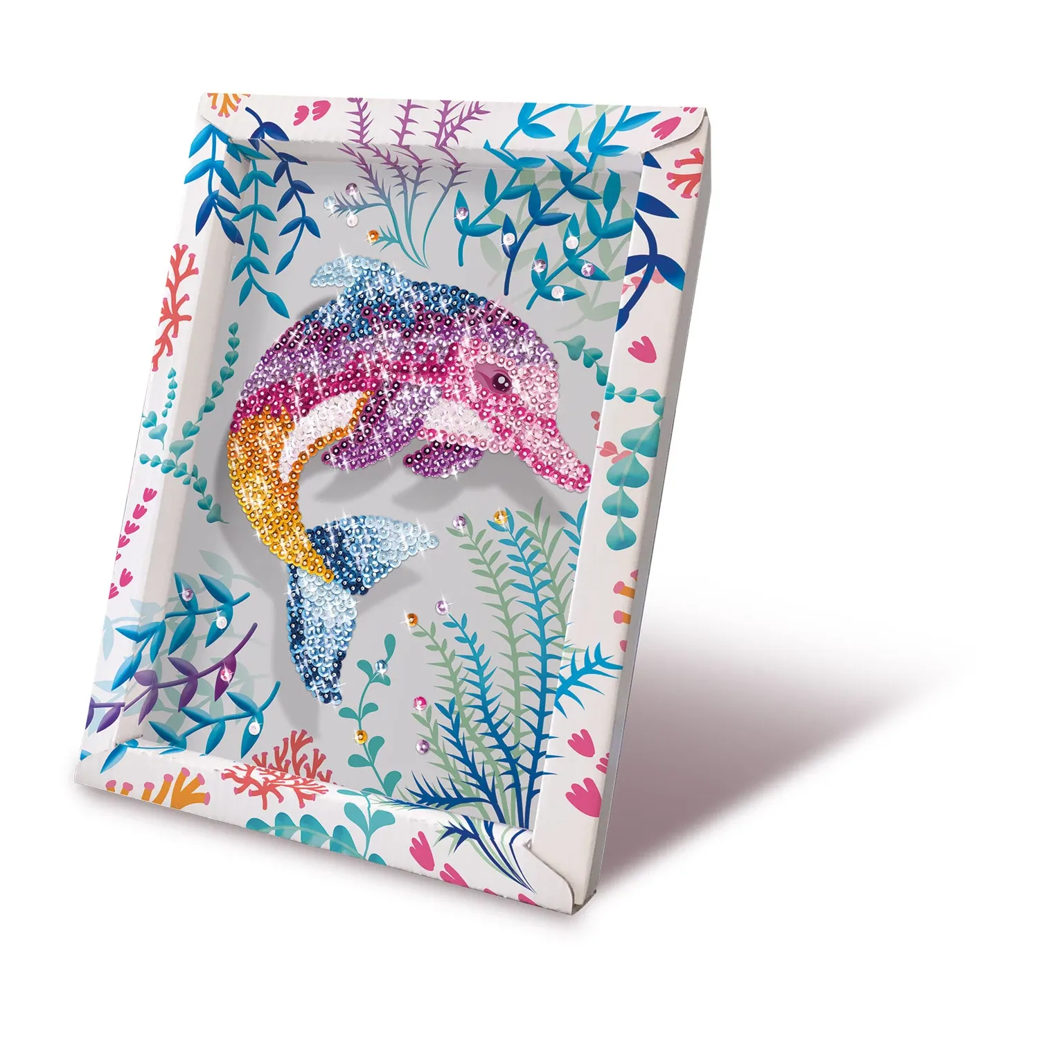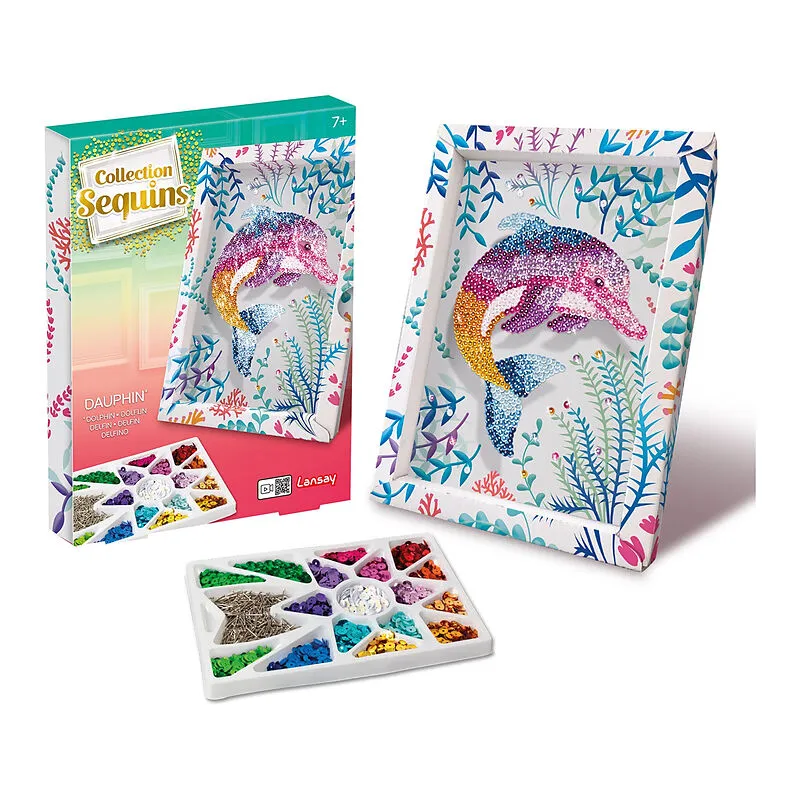Mit Pailletten ein schönes Bild kreieren. Die Abbildung eines Delfins liegt auf einer Styroporplatte, die als Basis für die Befestigung dient. Es sind kleine Nadeln enthalten. Inkl. Setzkasten als Ablage für die verschiedenen Pailletten. Dank dem Rahmen lässt ...