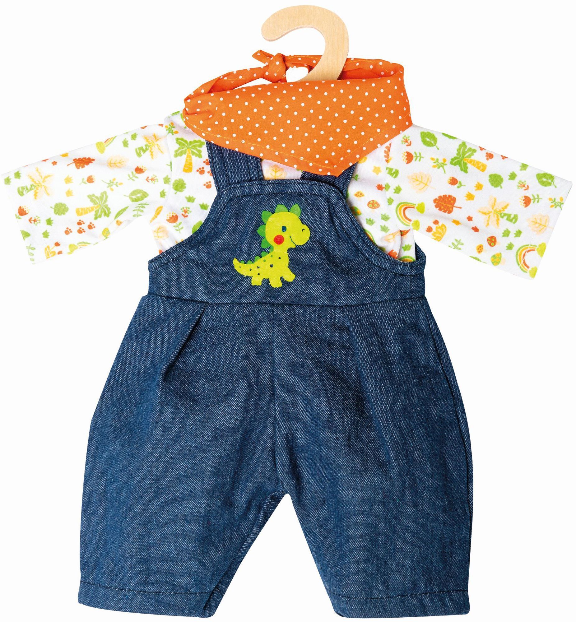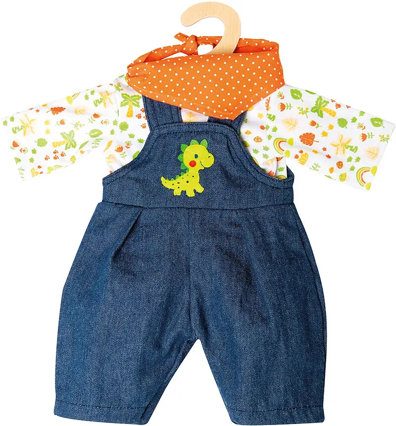 3-teiliges Puppen-Bekleidungsset bestehend aus Latzhose, Shirt und Halstuch, mit niedlicher Dino-Bestickung. Ein Klettverschluss ermöglicht kinderleichtes An- und Ausziehen. Kleiderbügel. Passend für Puppen der Grösse 28-35 cm.