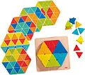 Mal ganz bunt und kreativ oder doch lieber ganz geordnet? Hier gibt es viele Möglichkeiten. Die 36 Dreiecke in 6 leuchtenden Farben lassen sich auf immer wieder neu in ihrem Holzrahmen kombinieren. Egal, ob man die Vorlagen umsetzt oder eigene Muster erfindet ...