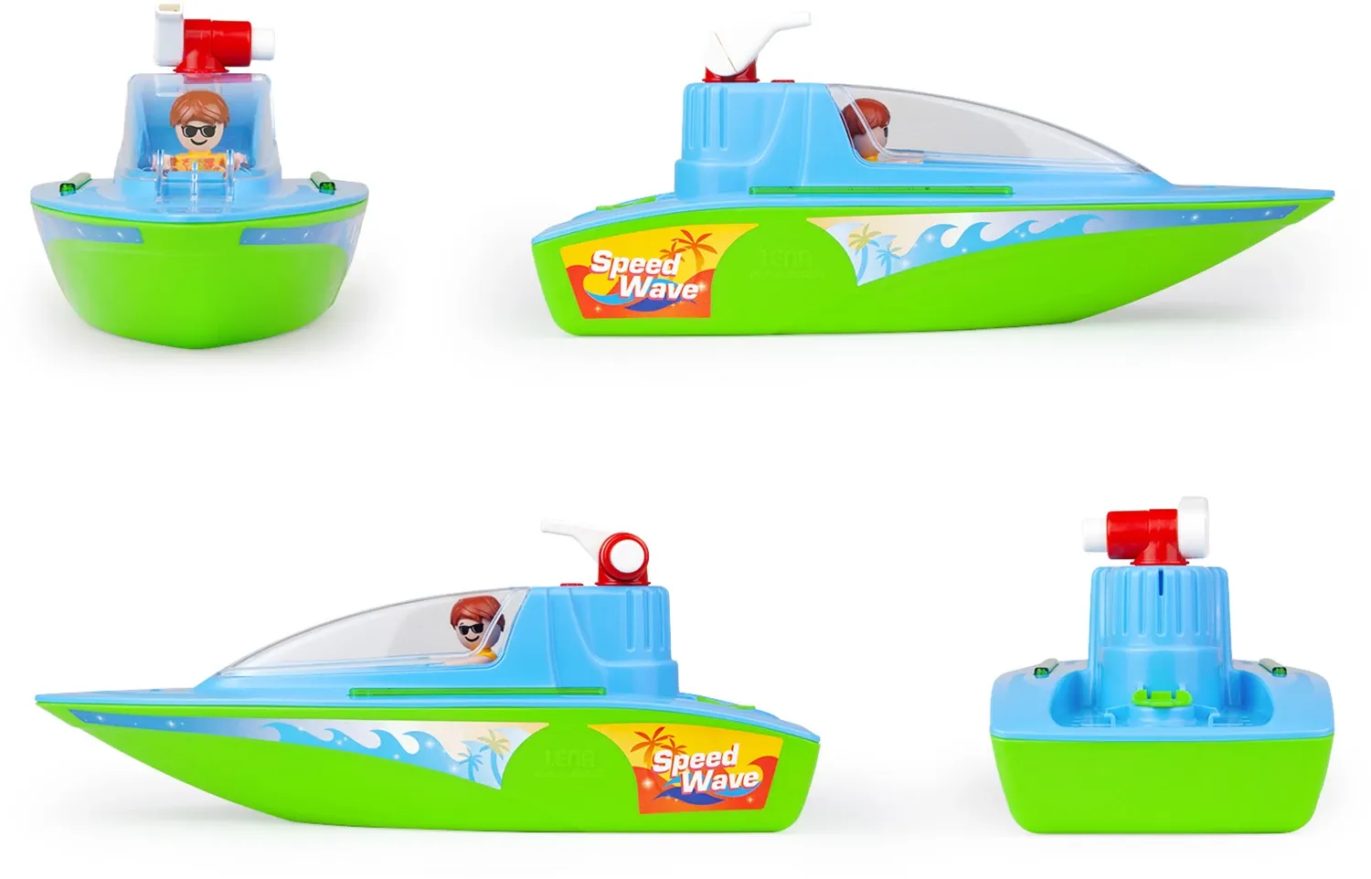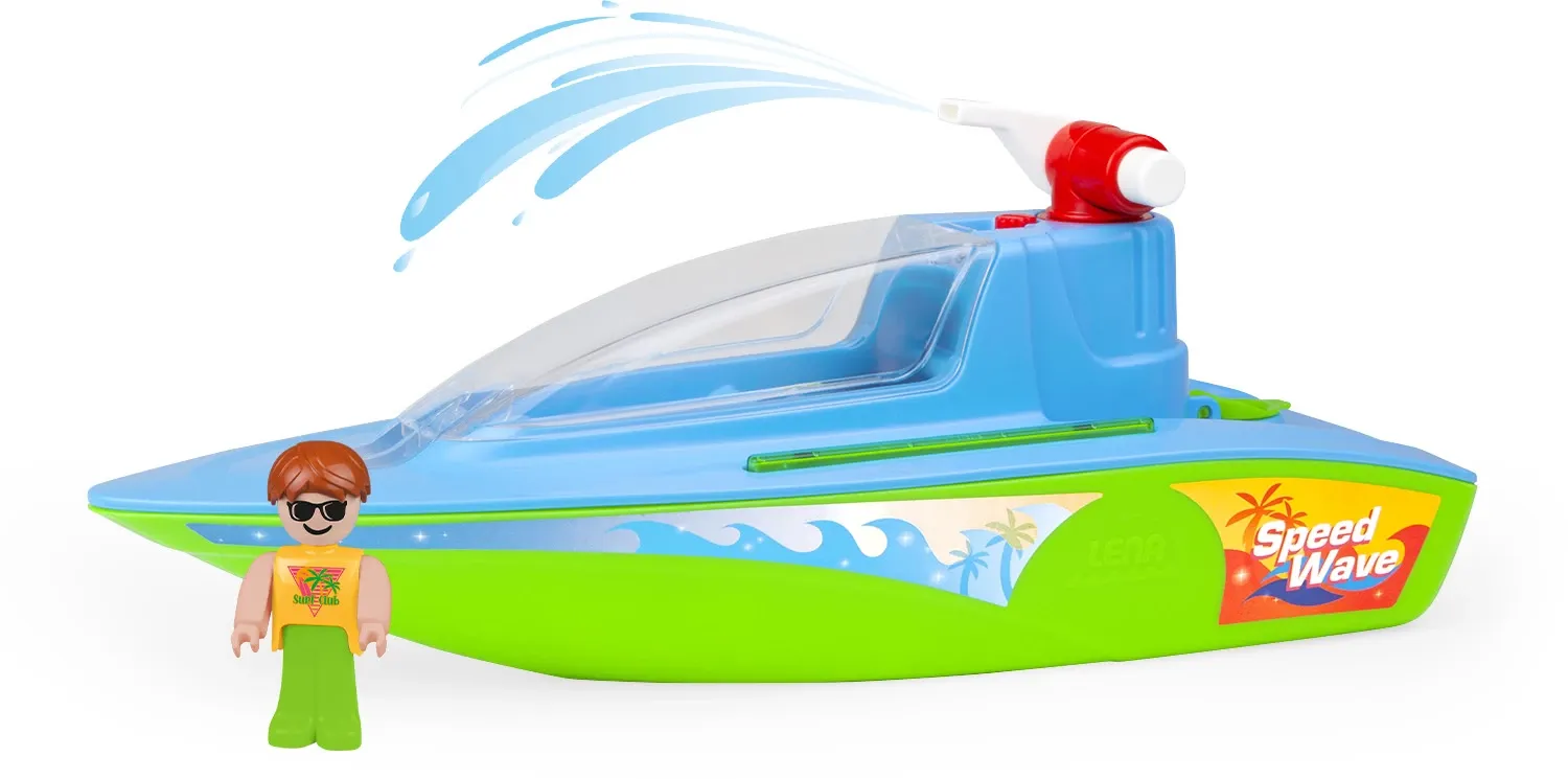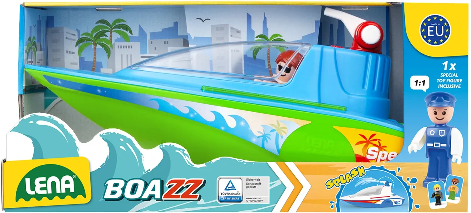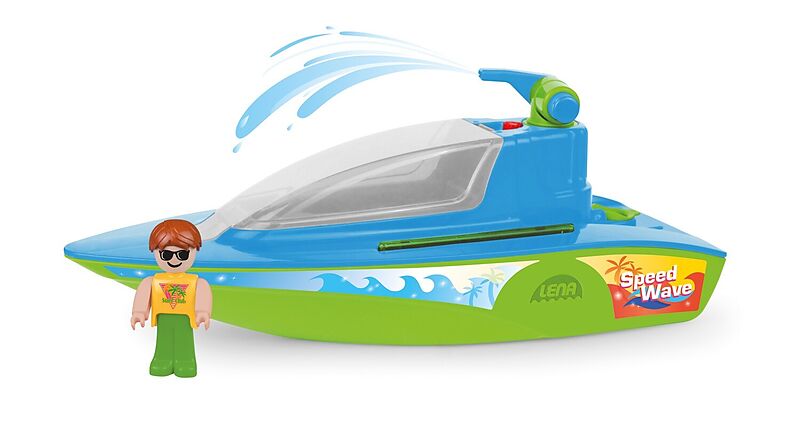 LENA BOAZZ Sportboot mit Pumpe. Kabine zum Öffnen und Bespielen. Zwei Sitzplätze. Mit Wassertank und Spritzfunktion. Mit LENA Spielfigur. Zusätzlich kann ein kleiner Katamaran (nicht im Lieferumfang enthalten) am Boot befestigt und transportiert werden. Abmess...