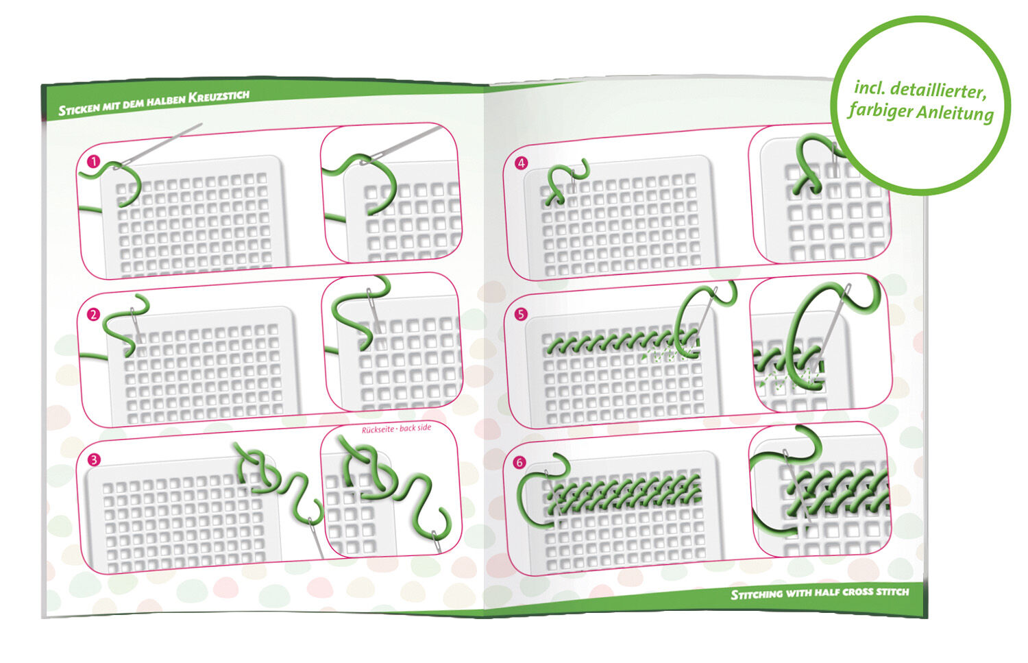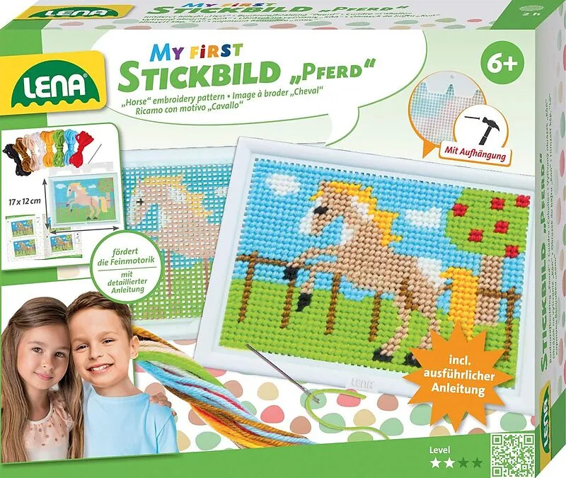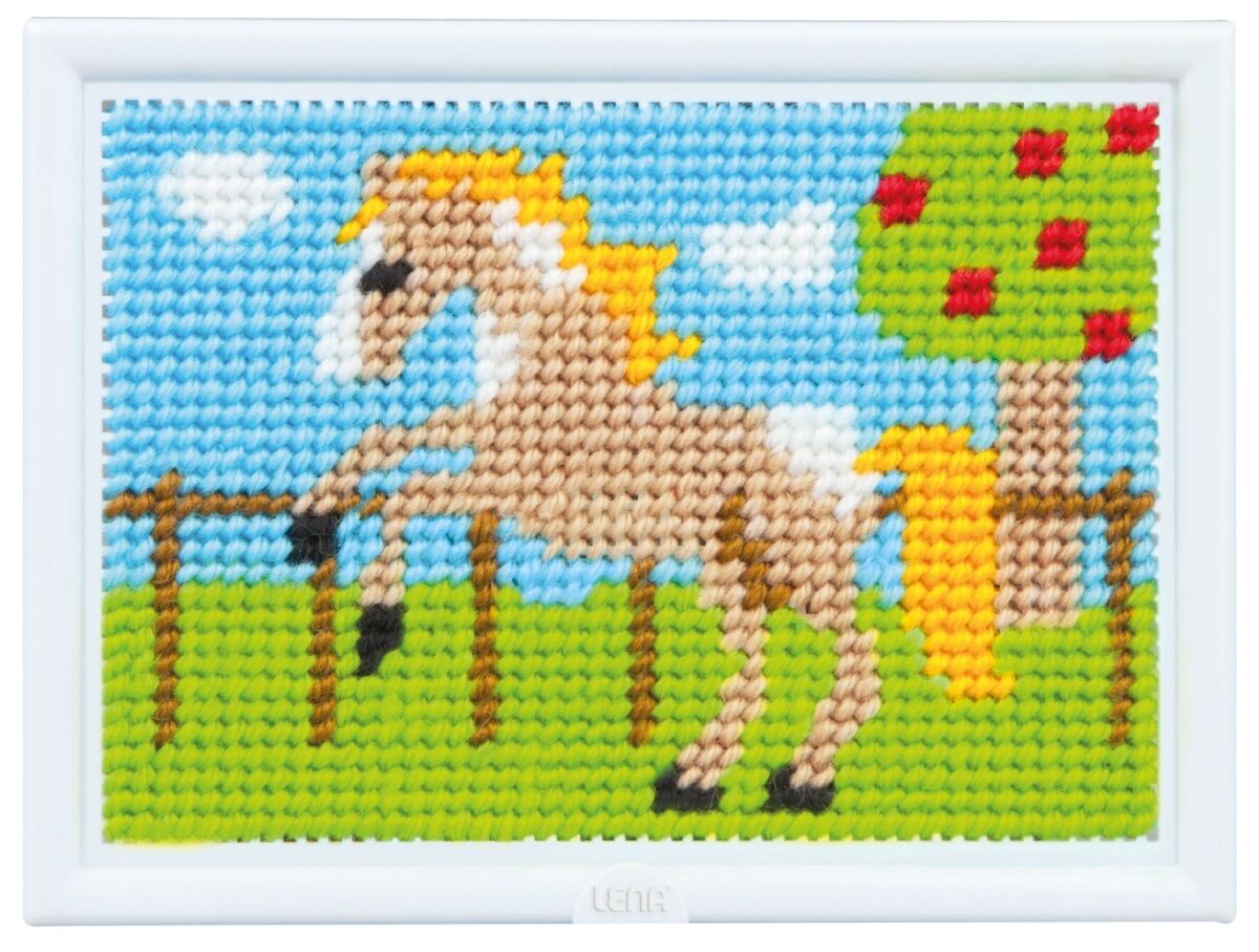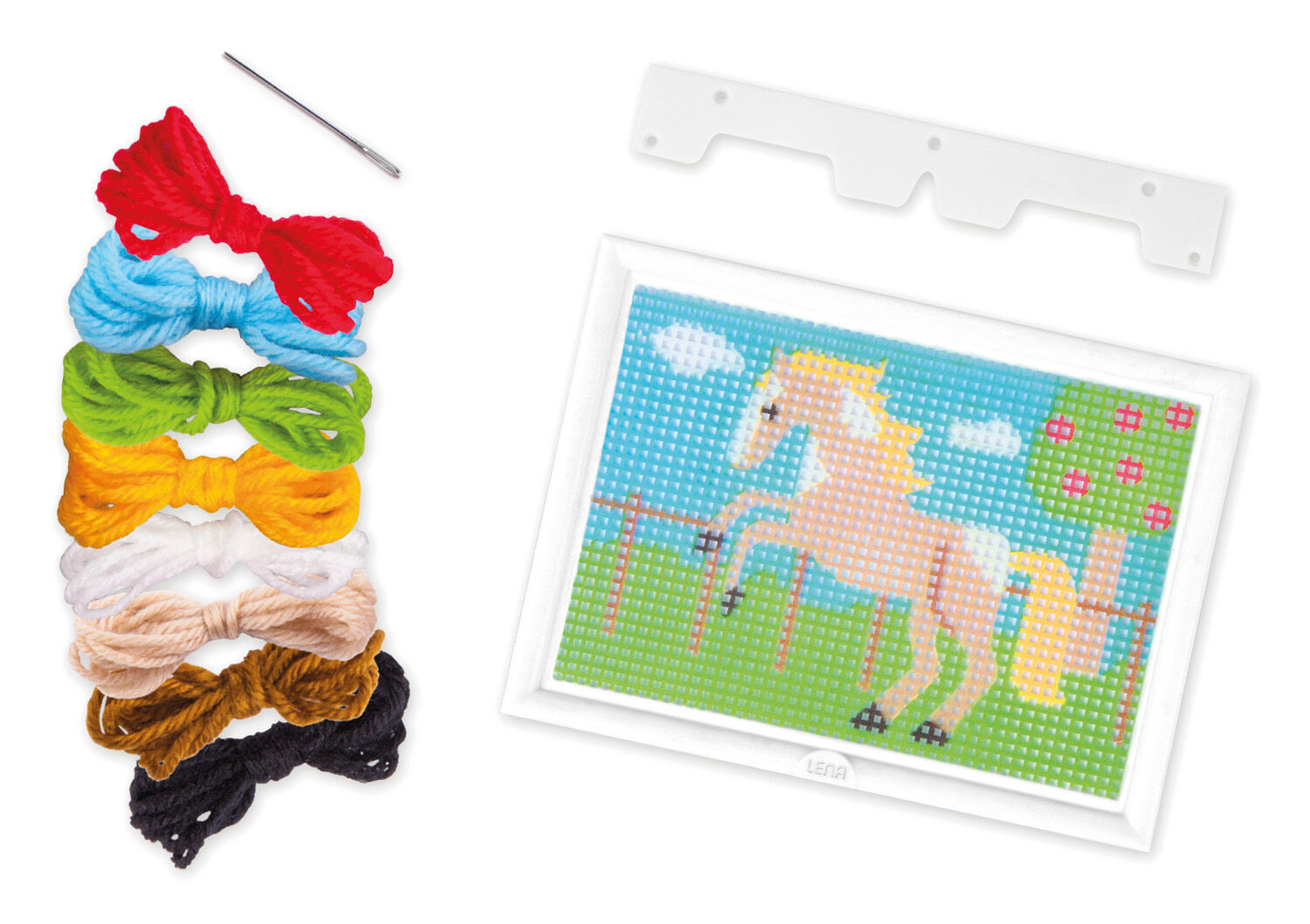 LENA Stickbild Pferd. Enthält 1 stumpfe Metallnadel, bunte Wolle und 1 vorgedrucktes Motiv im Bilderrahmen. 17 x 12 cm. Mit farbiger Anleitung. Geeignet für Kinder ab 6 Jahren. Verpackt in Faltschachtel mit Produktinformationen.