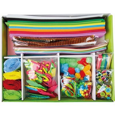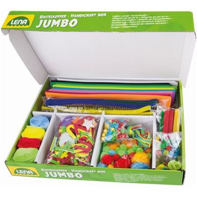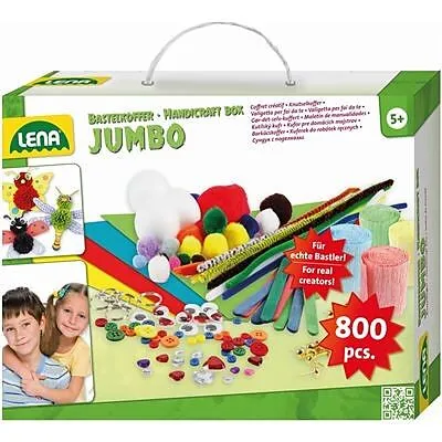 LENA Bastelkoffer Jumbo. Der Bastelkoffer enthält buntes Papier, Moosgummiteile, Pfeifenreiniger, Wackelaugen, Pompons, Kreppband, bunte Eisstiele, Knöpfe und vieles mehr. 800 Teile. Geeignet für Kinder ab 5 Jahren. Verpackt in Faltschachtel mit Produktinforma...