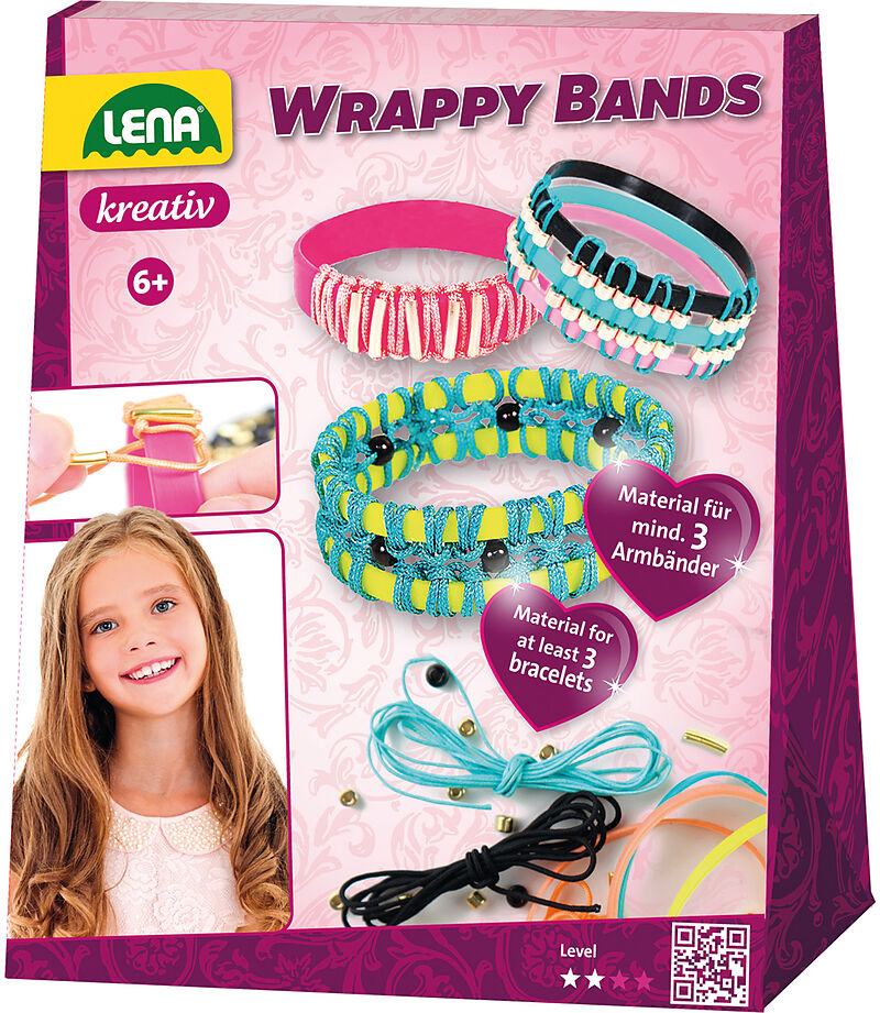 LENA Wrappy Bands - Kreative Armbänder selber gestalten! Mit diesem Komplettset Wrappy Bands von LENA können mindestens 3 individuelle Armbänder gebastelt werden. Dazu enthält das Set sieben Silikonarmbänder in fünf tollen Farben, Bänder zum Umwickeln in vier ...
