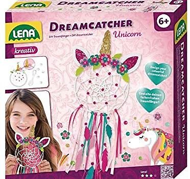 LENA Dreamcatcher Einhorn. Set enthält einen Kunststoffring, farbige Wolle, Satinbänder, Perlen, Nadeln und Garn, Füllwatte, sowie Filzteile zur Dekoration. - Geeignet für Kinder ab 6 Jahren. - Ausführliche und bebilderte Anleitung enthalten. - Packmaß: 21 x 5...