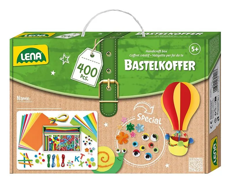 LENA Bastelkoffer. Der Bastelkoffer enthält buntes Papier, Moosgummiteile, Pfeifenreiniger, Wackelaugen, Pompons, bunte Eisstiele, Knöpfe und vieles mehr. 400 Teile. Geeignet für Kinder ab 5 Jahren. Verpackt in Faltschachtel mit Produktinformationen.